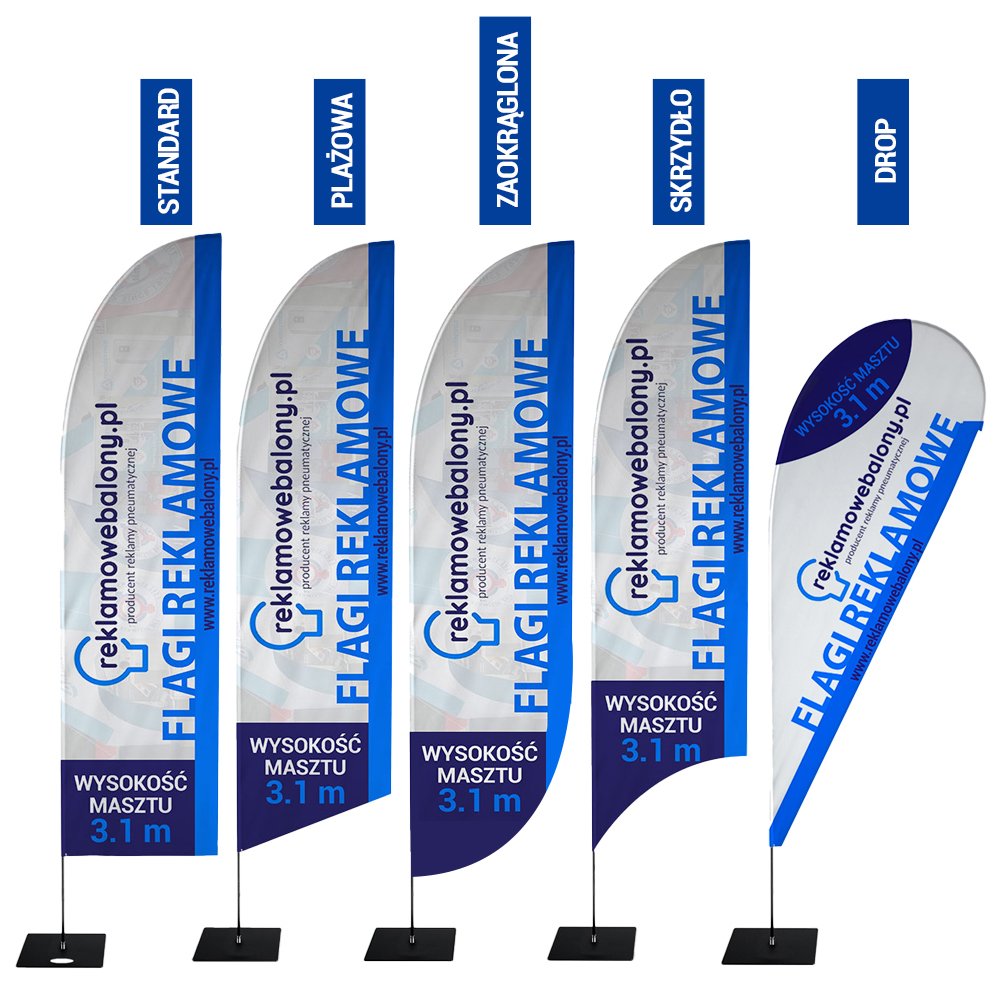 Drukujemy i szyjemy nawijaki reklamowe do tego mobilnego masztu flagowego o długości 3,1 m, które są dostępne w pięciu różnych kształtach: